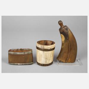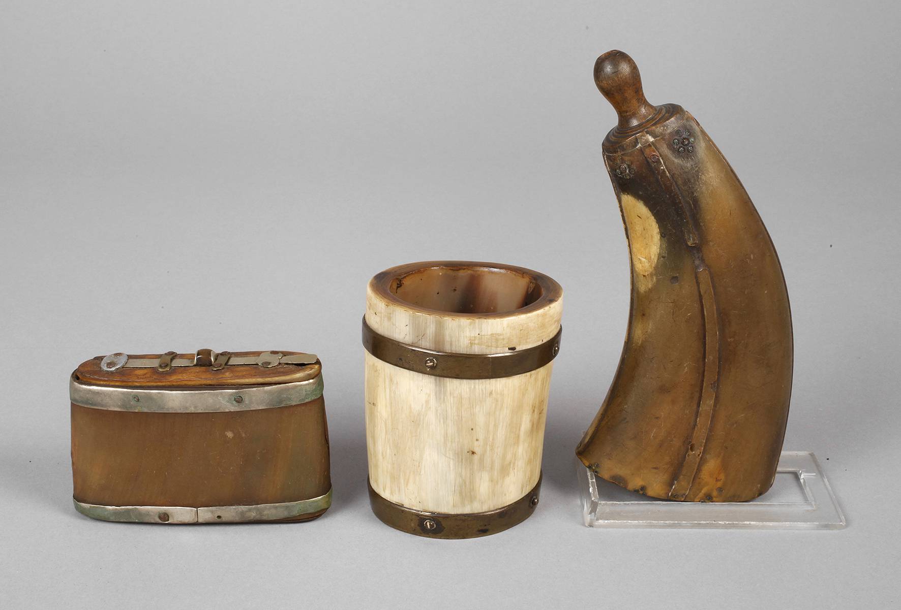 18./19. Jh., Horn geschnitzt, Messingmontierungen, Becher, Schnupftabakdose und Pulverflasche, Altersspuren, partielle Substanzverluste, L max. 17,5 cm.