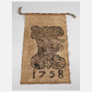 1758, Leinen, eine Seite rot bedruckt mit Wappenlöwe unter den Initialen des Landgrafen, die andere Seite in Schwarz mit Kippfigurendarstellung eines Türken und eines Jägers, normale Alters- und Gebrauchsspuren, originales Strickfragment, Maße ca. 71 x 41 cm.