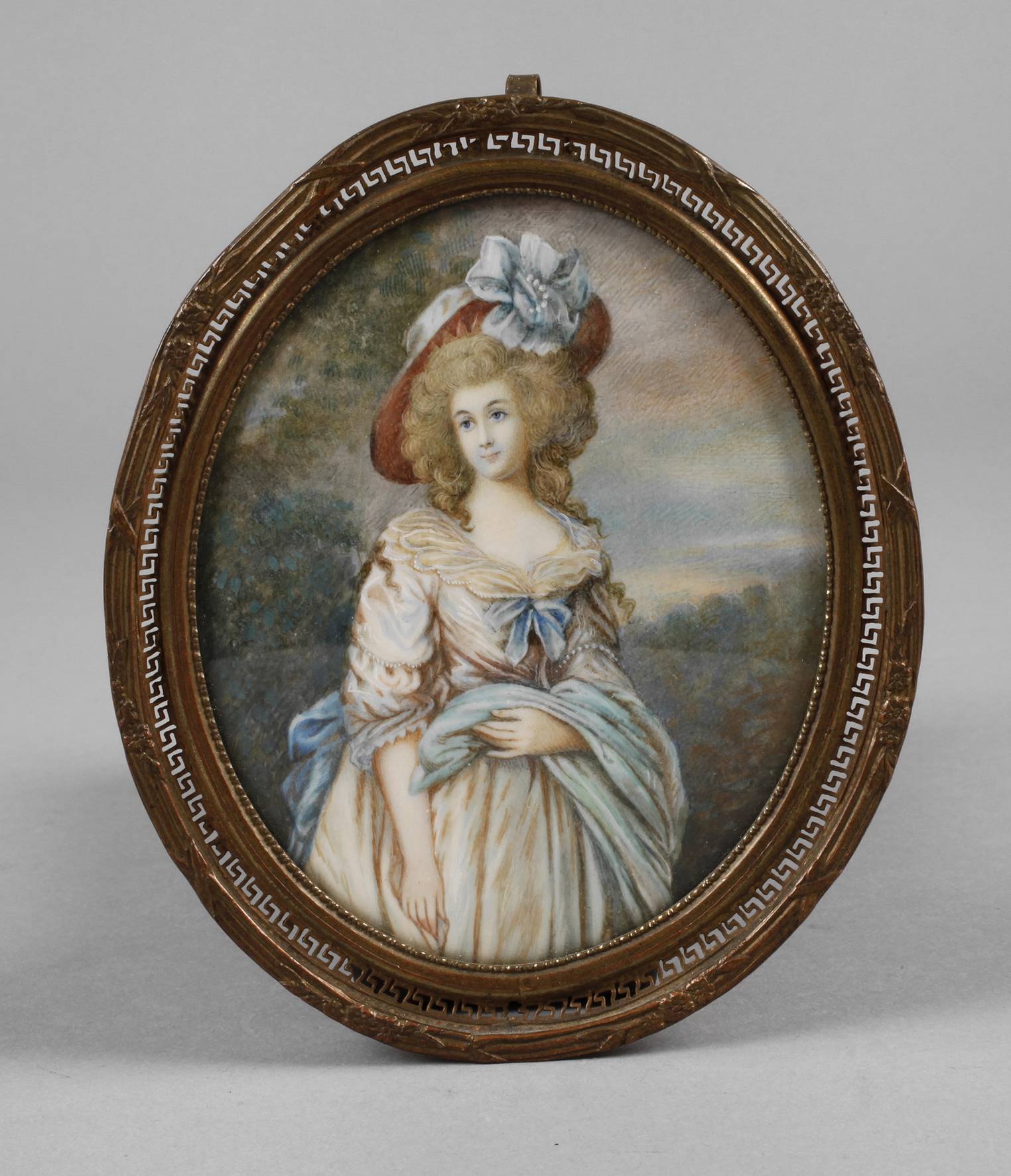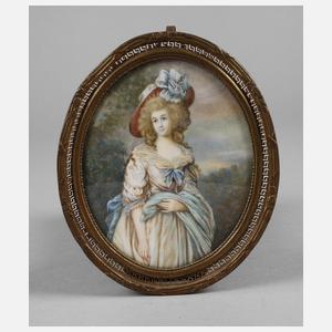 Anfang 20. Jh., unsigniert, Gouache auf Elfenbein, Bildnis einer Rokokodame vor weiter Landschaft, hinter Glas in schmaler Messingleiste gefasst, min. Altersspuren, Maße 9,5 x 7,5 cm. BITTE BEACHTEN: VERSAND ERFOLGT NUR INNERHALB DER EU – SHIPPING TO THE EU MEMBER COUNTRIES ONLY!