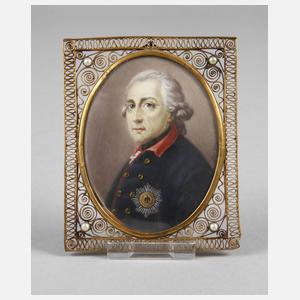 Anfang 20. Jh., signiert Stahl, Gouache auf Elfenbein, Schulterstück des Preußenkönigs Friedrich II. im Uniformrock, vor monochromem Grund, hinter Glas in schmaler Messingleiste gefasst, min. Altersspuren, Maße 8,5 x 6,5 cm. BITTE BEACHTEN: VERSAND ERFOLGT NUR INNERHALB DER EU – SHIPPING TO THE EU MEMBER COUNTRIES ONLY!