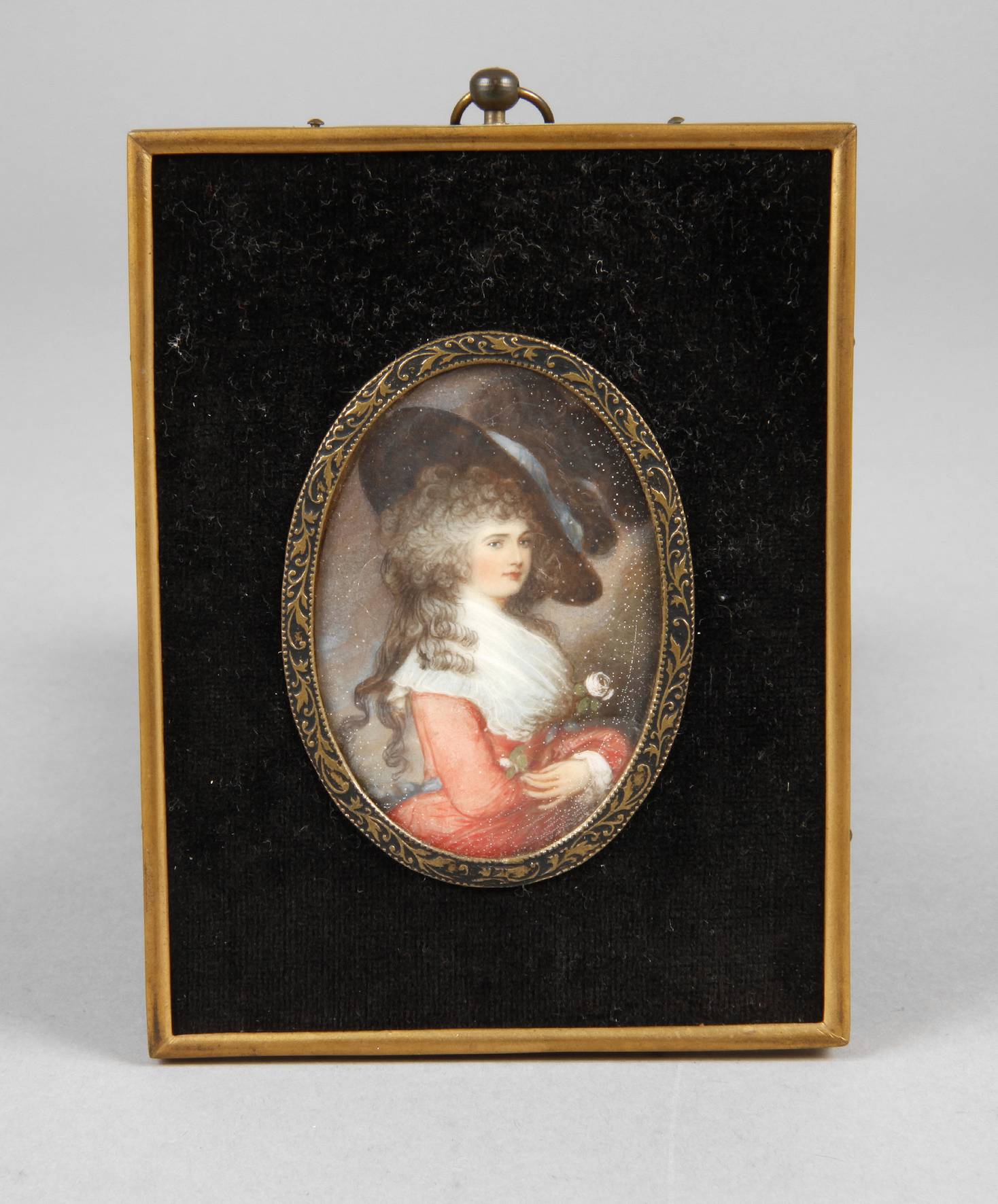 Anfang 20. Jh., unsigniert, Gouache auf Elfenbein, Halbfigurenbildnis einer Rokokoschönheit vor monochromem Grund, hinter Glas in schmalem Messingrahmen gefasst, IM 5 x 3,5 cm. BITTE BEACHTEN: VERSAND ERFOLGT NUR INNERHALB DER EU – SHIPPING TO THE 28 EU MEMBER COUNTRIES ONLY!