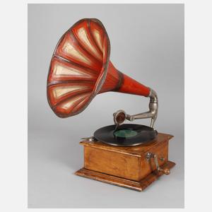 um 1920, ungemarkt, quadratisches, braun gebeiztes Holzgehäuse, vernickelte Metallteile, originale Kurbel, Drehteller und Tonabnehmer, großer facettierter und farbig gefasster Trichter, Werk reparaturbedürftig, Oberfläche mit Altersspuren, H ca. 60 cm.