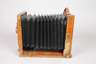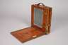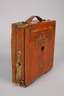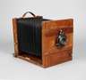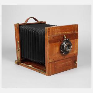 Anfang 20. Jh., ungemarkt, Gehäuse in Mahagoni furniert, vergoldete Metallteile, Objektiv gemarkt Hugo Meyer & Co. Görlitz, Doppelanastigmat F:5, F=180mm, intakter schwarzer Lederbalg, Alters- und Gebrauchsspuren, Plattenmaß 18 x 13 cm.