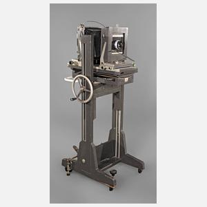 um 1970, gemarkt Globica, auf Etikett bezeichnet hergestellt in der Deutschen Demokratischen Republik, silberbronziertes Holzgestell, mittels Kurbel höhenverstellbare Kamera mit intaktem Faltenbalg, Objektiv gemarkt Meoptar 4,5/210, Alters- und Gebrauchsspuren, H 130 cm.