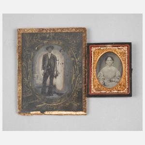 19. Jh., ungemarkt, Ganzfigurenbildnis eines Paares sowie Halbfigurenbildnis einer jungen sitzenden Frau, dieses im geprägtem Lederetui, Erhaltungsmängel, Maße 7 x 6 cm und 12 x 10 cm.
