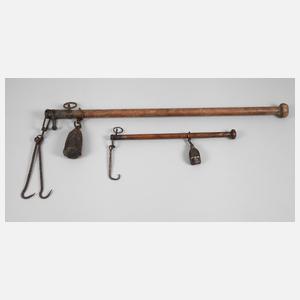 18. Jh., Griffstücke aus Holz, teils ornamental verziert, eine mit zahlreichen Eichangaben ab 1745, schmiedeeiserne Montierungen und Gewichte, Alters- und Gebrauchsspuren, L 43 und 83 cm.