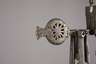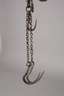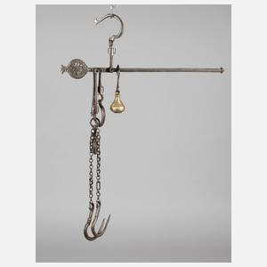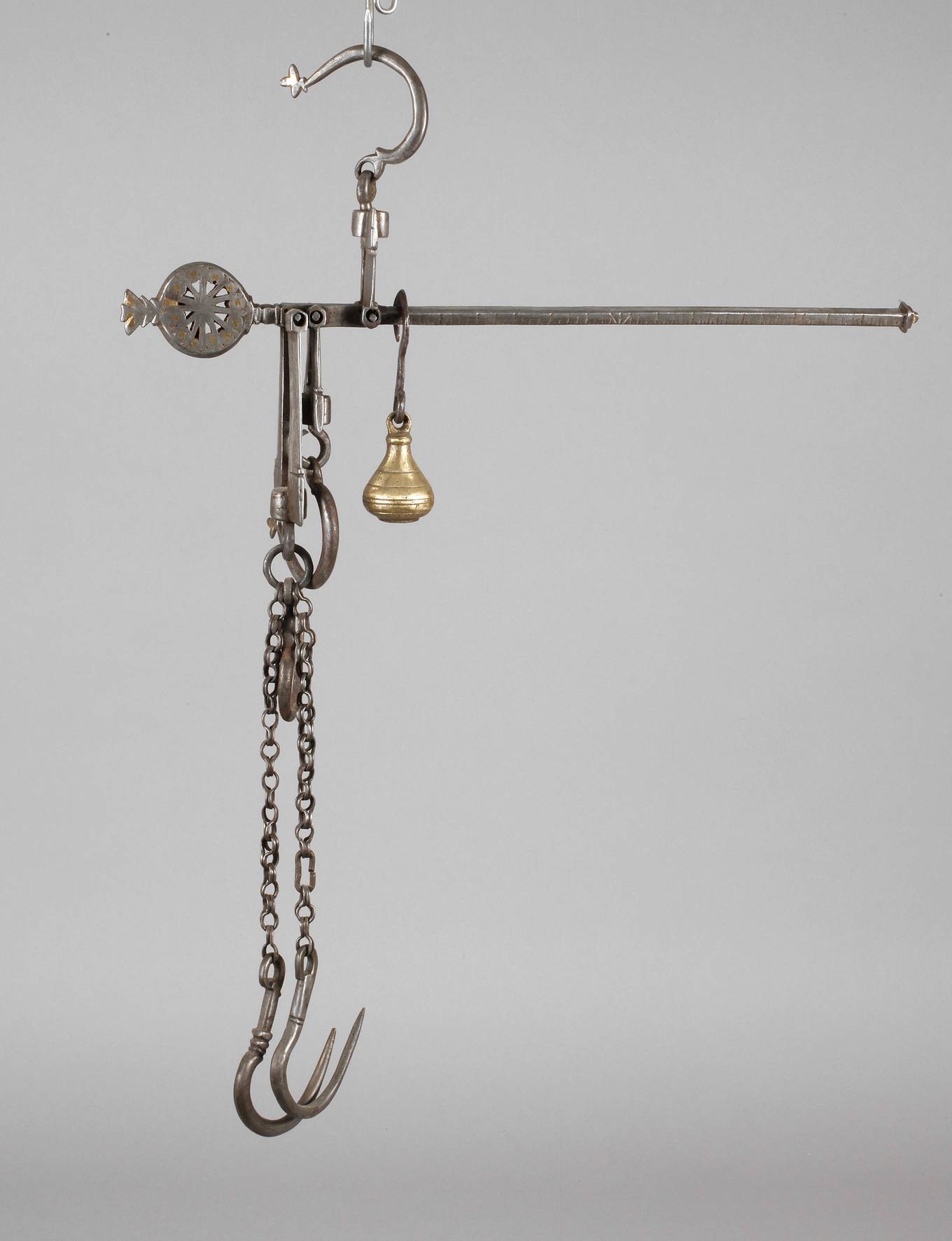 um 1700, Schmiedeeisen, verziert mit Messingtauschierungen sowie abgehängtes Gewicht aus Messing, funktionstüchtig, Altersspuren, L 42 cm.