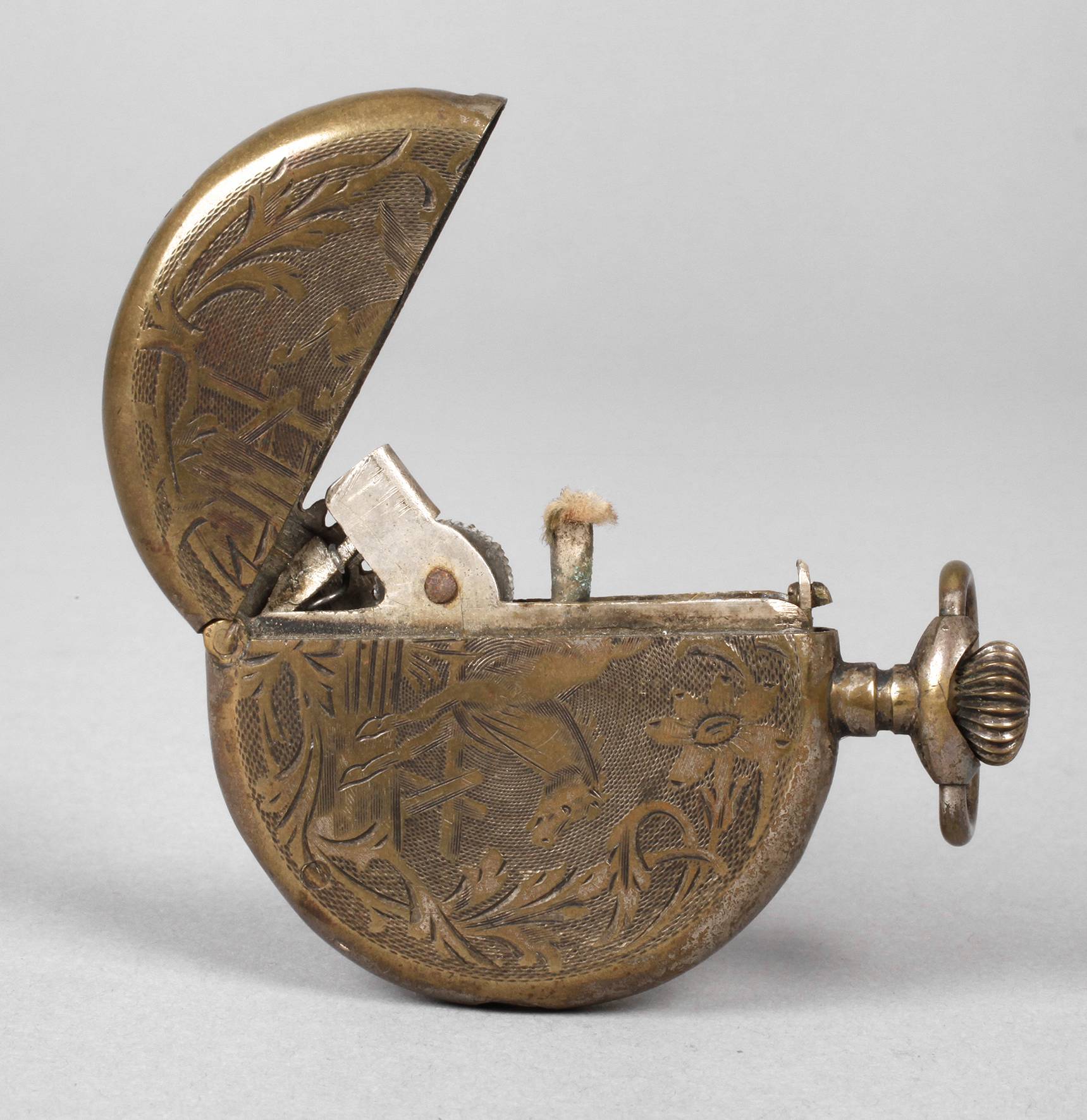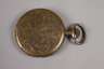 1920er Jahre, ungemarkt, Messing versilbert, in Form einer Taschenuhr gestaltetes Gehäuse mit fein ziseliertem Grund, Funktion nicht geprüft, Alters- und Gebrauchsspuren, L 6 cm.