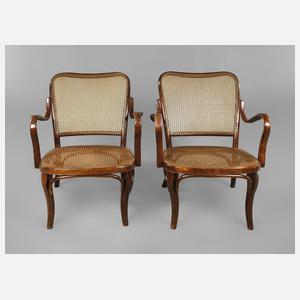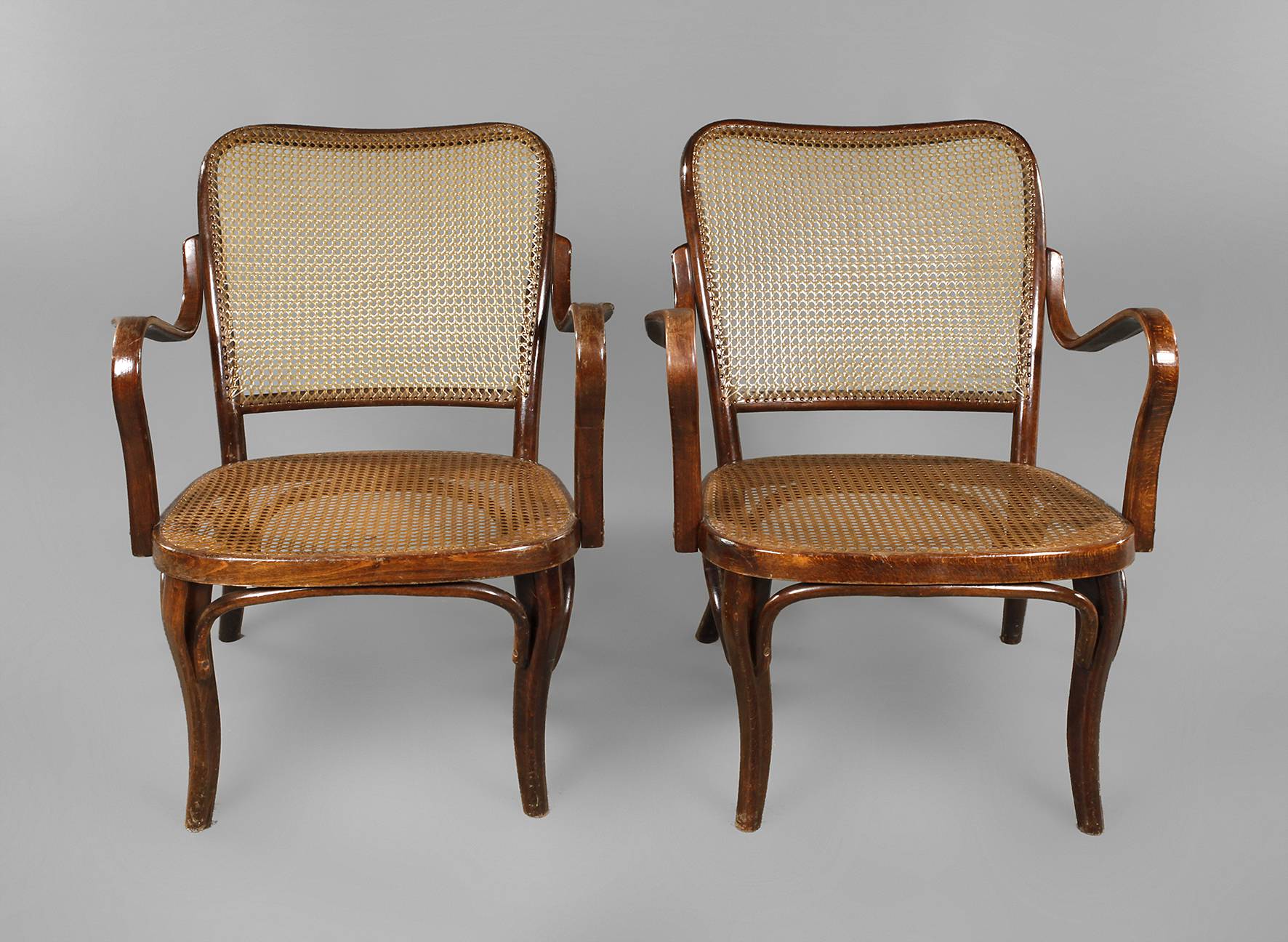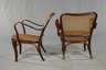 1930er Jahre, Kaminfauteuils entworfen von Josef Frank für Thonet, Modellnummer A 752, Ausführung Tscheschien um 1940, Buchenbugholz braun gebeitz, verschraubt, Sitzfläche und Lehne mit Wiener-Geflecht, guter Zustand, H 71 cm.