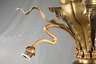 um 1900, Bronze vergoldet, in Form einer Sonnenblume gestaltetes Gestell, mit plastischen Blättern und Blüte sowie drei geschwungenen Leuchterarmen, jeweils eine Lampenfassung tragend, mittig zudem ein abgehängter Opalglasschirm, insgesamt vierflammig elektrifiziert, H ca. 40 cm, D ca. 50 cm.