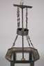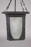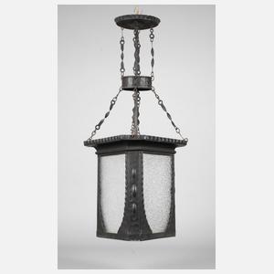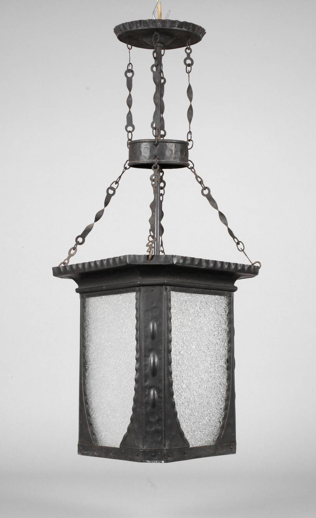 deutsch, um 1910, geschwärztes, schmiedeeisernes Gestell mit Hammerschlagdekor und plastischen Olivmotiven, eingesetzte Segmente aus klarem Ornamentglas, einflammig elektrifiziert, Altersspuren, H 70 cm, D 30 cm.