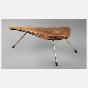 in der Art von Carl Auböck, wohl Wien, 1960er Jahre, Platte aus massivem Nussbaum mit Rinde bzw. Baumkante, getragen von drei Beinen aus Messing mit Gummifüßen, Maße 37 x 87 x 40 cm.