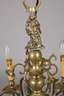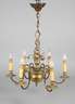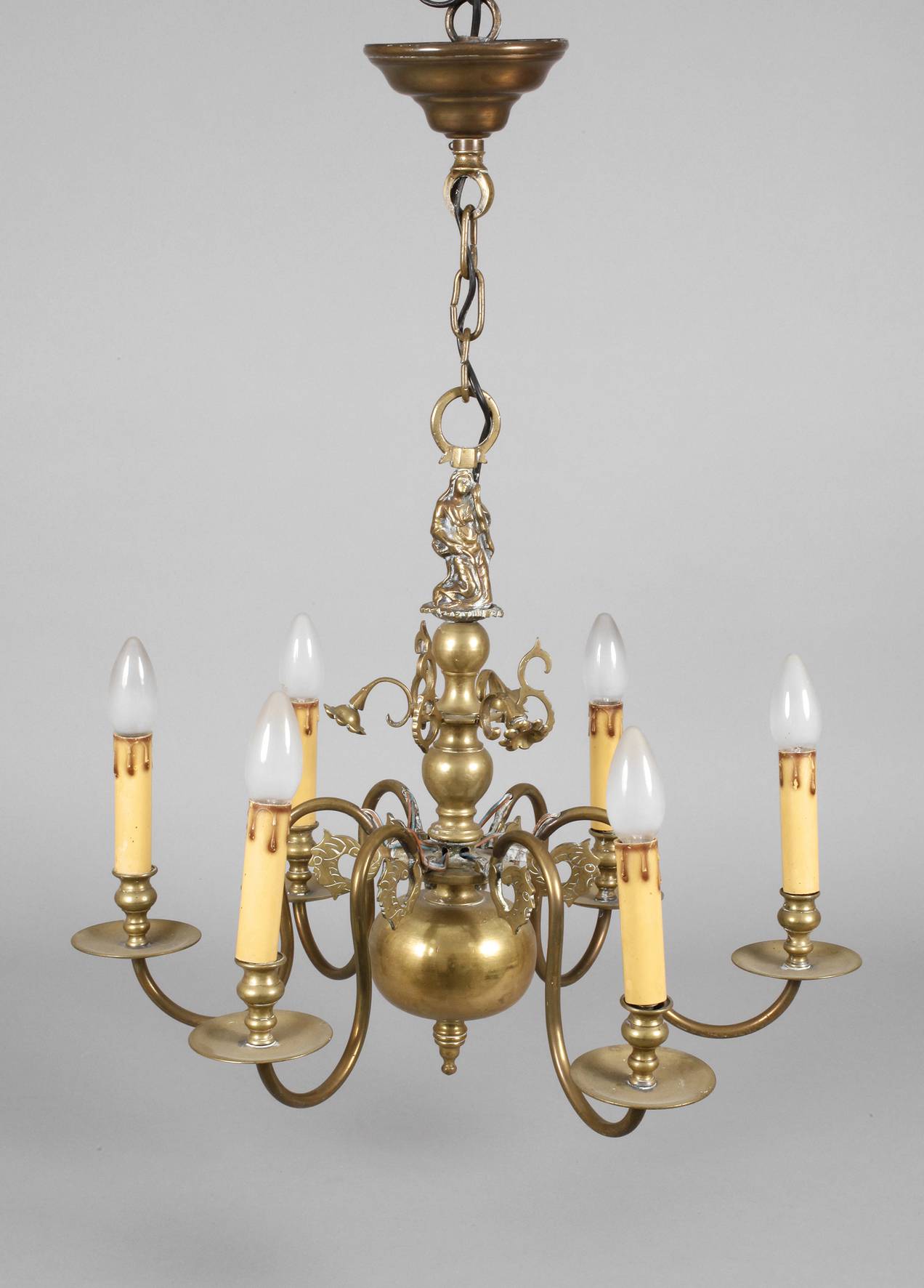 Ende 19. Jh., Bronze gegossen, kurzer Balusterkorpus mit plastischer Darstellung der Mater dolorosa, mit sechs s-förmig geschwungenen Leuchterarmen und stilisiertem floralen Dekor, sechsflammig elektrifiziert, Altersspuren, H ca. 75 cm, D ca. 60 cm.