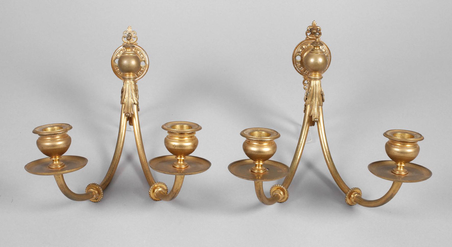 1920er Jahre, ungemarkt, Messing massiv und vergoldet, schlanker zweiarmiger Ausleger, verziert von Akanthusblättern, jeweils zwei Tüllen tragend, ohne Elektrik, Tiefe je 20 cm.