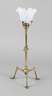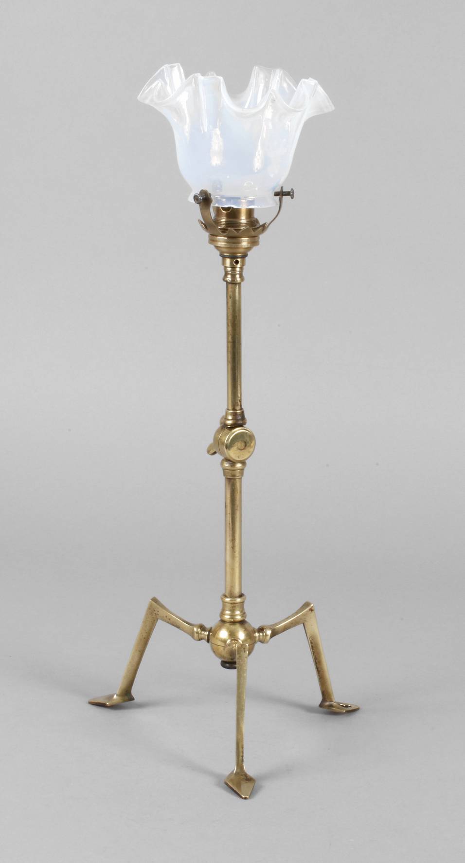 wohl England, um 1915, unsigniert, in der Art von William A. Smith Benson, Messing vergoldet, schlanker Schaft über dreibeinigem Stand, mittels Rädelschraube neigbar, aufgesetzter Blütenschirm aus Opalglas, einflammig alt elektrifiziert, Verkabelung fehlt, Schirm am Rand mit kleinem Chip, H 43 cm.