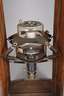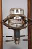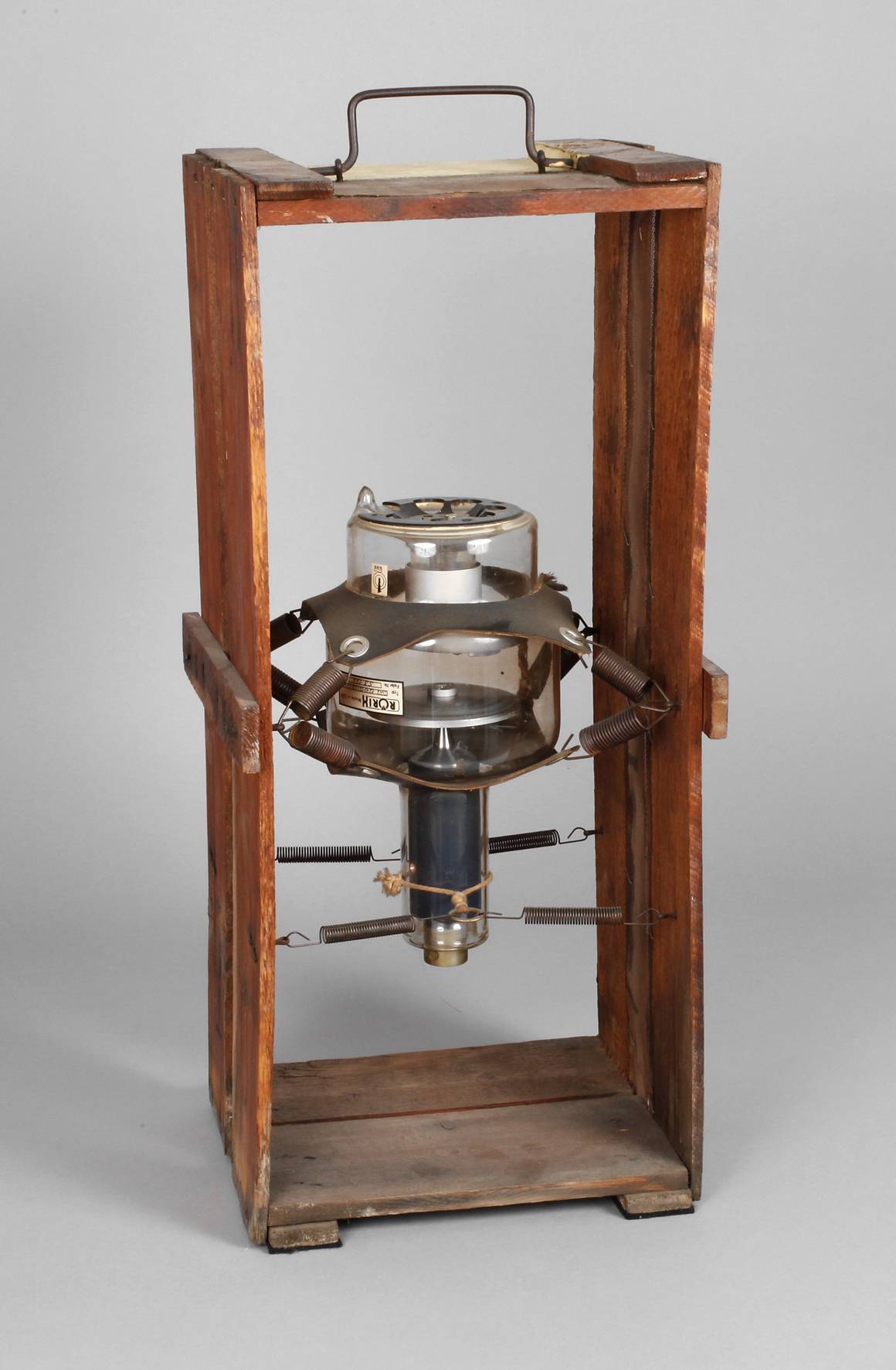 Mitte 20. Jh., mit altem unleserlichen Klebeetikett Rudolstadt Thüringen, Weichholzgehäuse mit eingelassener Metallgaze, an Spiralfedern befestigte Röntgenlampe der Firma Rörix, H 60 cm.