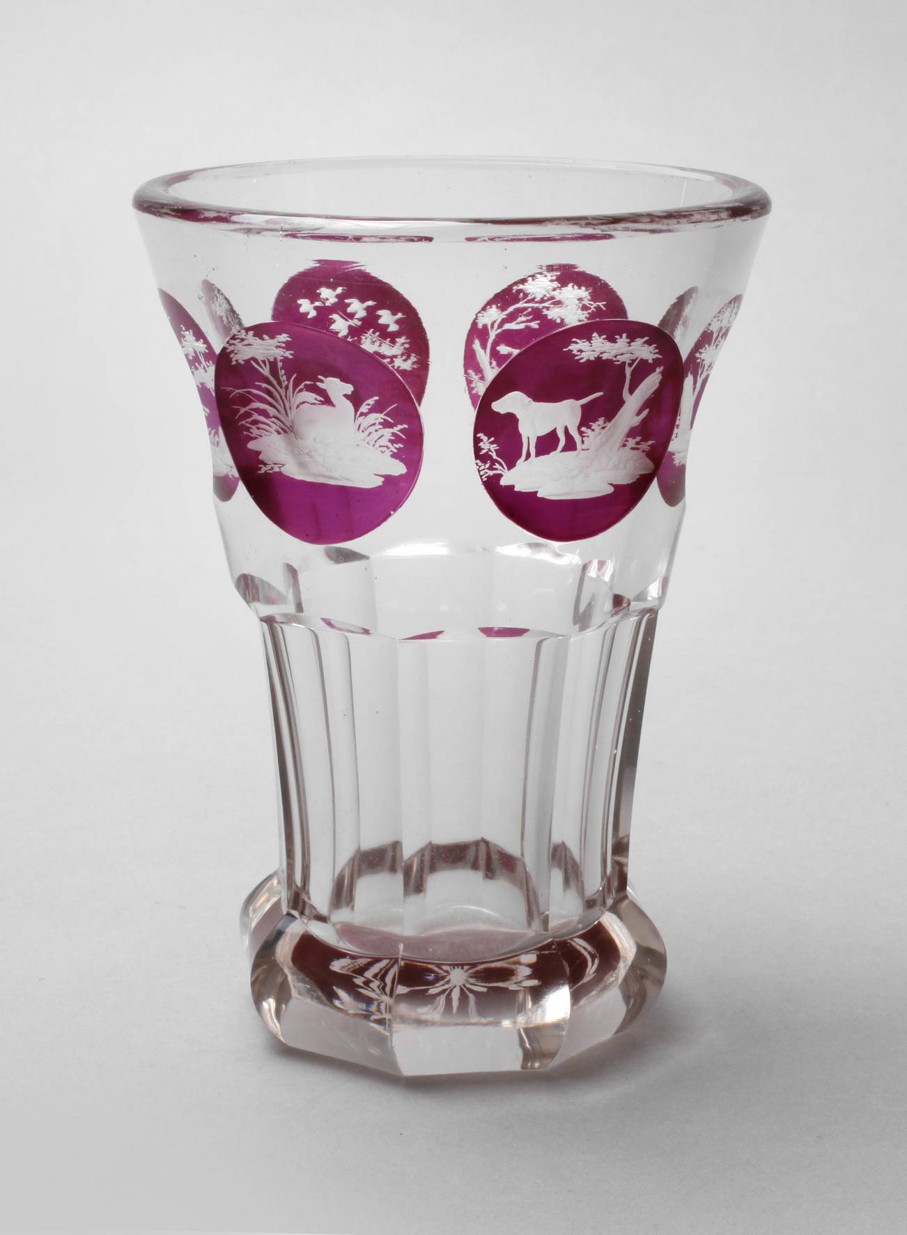 Mitte 19. Jh., farbloses Glas, ausgekugelter Abriss, rotgebeizter Kugelschliff mit matt geschnittenen Darstellungen von Wildtieren und Hunden im Wald, normale Altersspuren, H 13 cm.