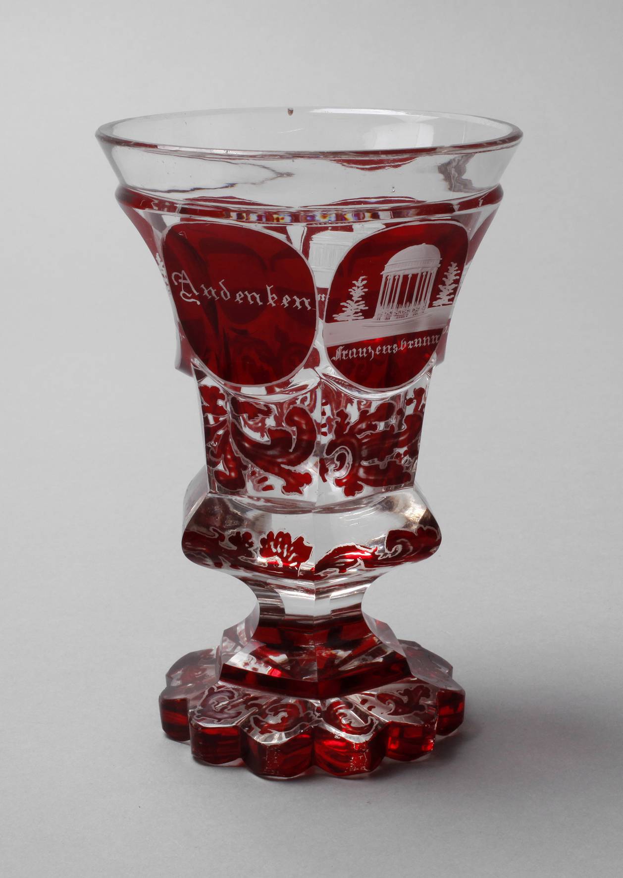 2. Hälfte 19. Jh., farbloses Glas, rot gebeizt, geätzt und matt graviert, Ansichten von Franzensbrunn, Louisenquelle, Bach und Wiesenquelle, Badehaus und Gasbad, am Fuß und Lippenrand winzigst kleine Kerben, sonst unbeschädigt, H 13,5 cm.