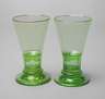 2. Hälfte 19. Jh., in Gold gepinselte Signatur im ausgekugelten Abriss, Scheibenfuß, hohl gearbeiteter, facettierter Schaft, leicht ausschwingende Kuppen, Goldstreifendekor, dieser etwas berieben, sonst guter unbeschädigter Zustand, H je 12 cm.