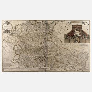 oben links in Kartusche bezeichnet „To his Grace John Duke of Marleborouch Prince of Mindelheim ...“, unten links betitelt „A new Map of Germany, Hungary, Transilvania & the Suisse...“ sowie Angabe des Kartographen Hermann Moll, verlegt bei Thomas Bowles, im oberen rechten Bereich Innenansicht des englischen Parlaments, Darstellung des Gebiets zwischen Lübeck im Norden, Mergenburg im Osten, Golf von Venedig im Süden und Paris im Westen, Kupferstich, grenz- und teilkoloriert, 1712, mittig übliche Faltlinie, geringe Altersspuren, unter Passepartout und zwischen zwei Scheiben gerahmt, Darstellungsmaß ca. 61 x 100,5 cm.