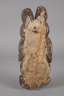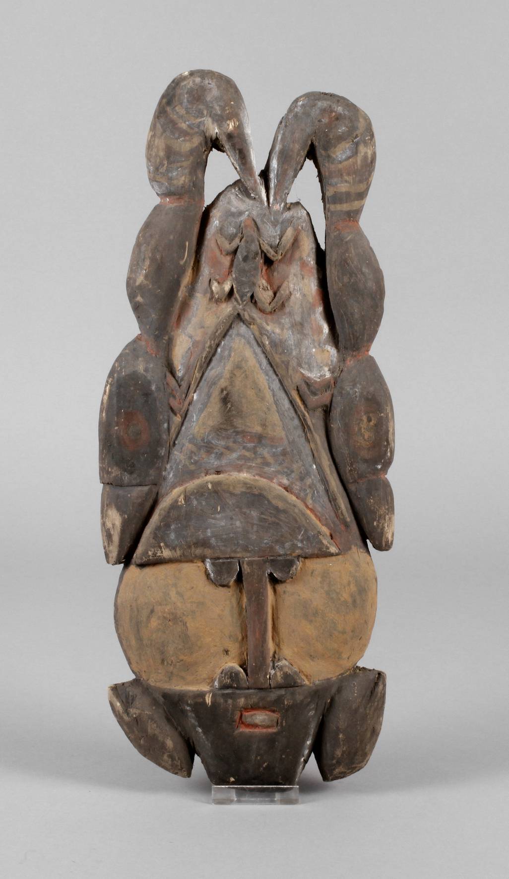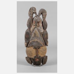 2. Hälfte 20. Jh., flache Weichholzscheibe, in verschiedenen Erdfarben bemalt, über dem Gesicht Aufbau mit Frosch und zwei stilisierten Vögeln, H 45 cm.