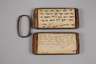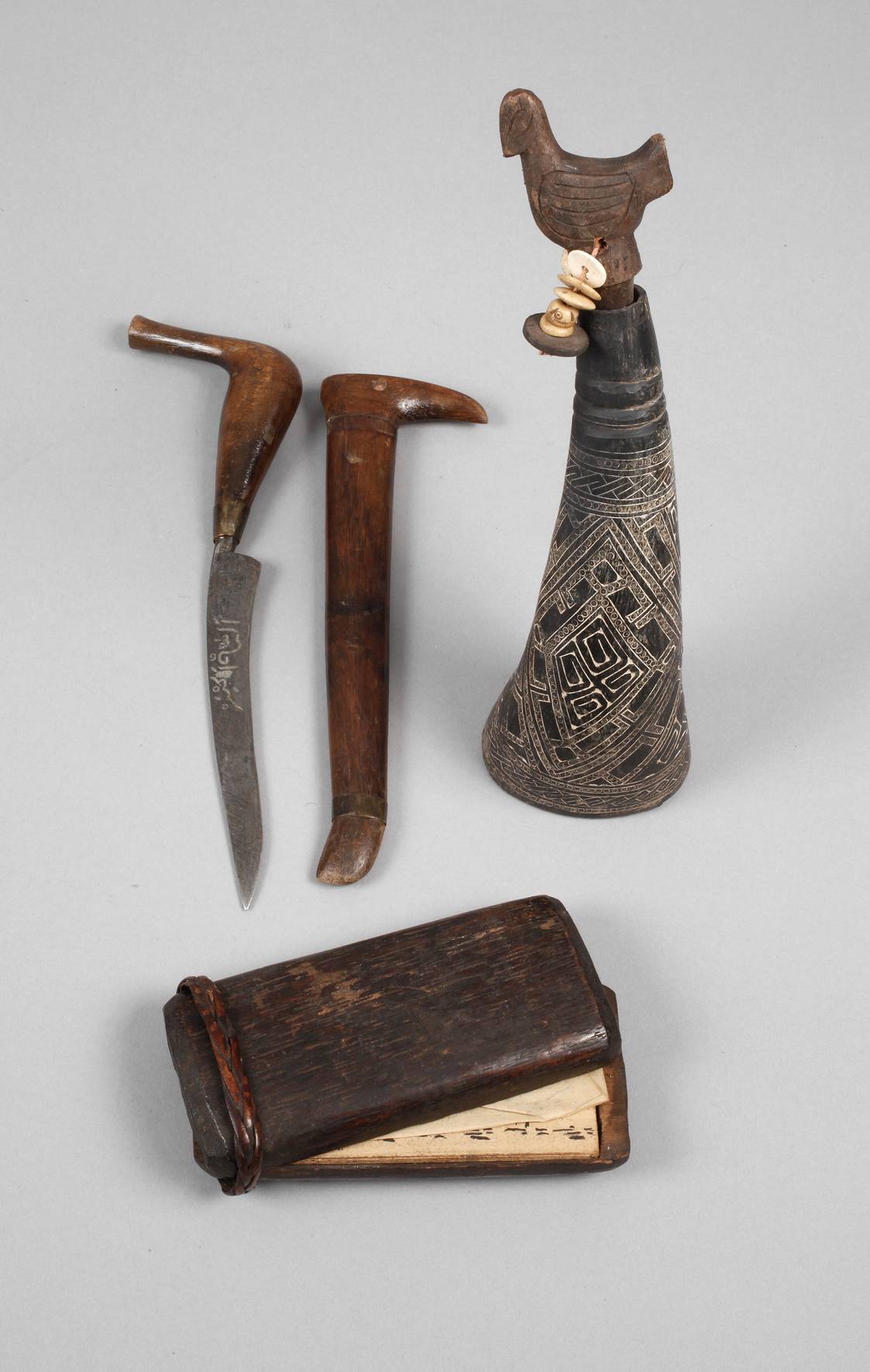 bestehend aus kleinem Kris, vermutlich Java, Klinge mit silbertauschierter Schrift, L 28 cm, dazu Pulverhorn aus dunklem Horn, mit feiner geometrischer Gravur, Verschluss mit figürlichem Knauf in Form eines Huhns, L 23 cm, sowie kleine Schriftdose der Batak Karo, bestehend aus zwei Hälften, gefüllt mit originalen Schriftstücken, L 12 cm.