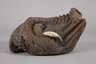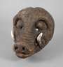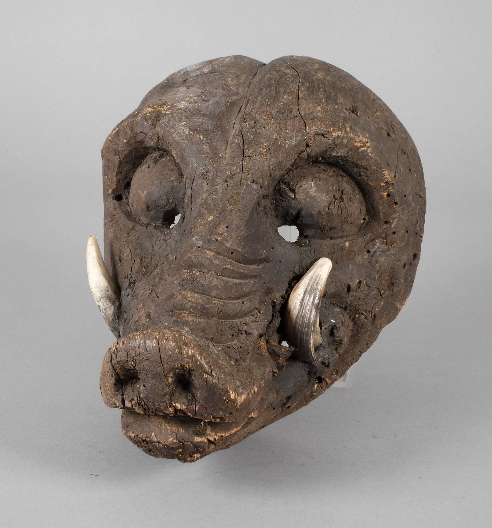 1. Hälfte 20. Jh., Weichholz braun gefasst, vollplastische Darstellung eines kleinen Eberhauptes mit zwei eingesetzten Hauern, etwas verwittert, starker, inaktiver Termitenbefall, attraktives Sammlerstück, H 28 cm.