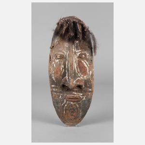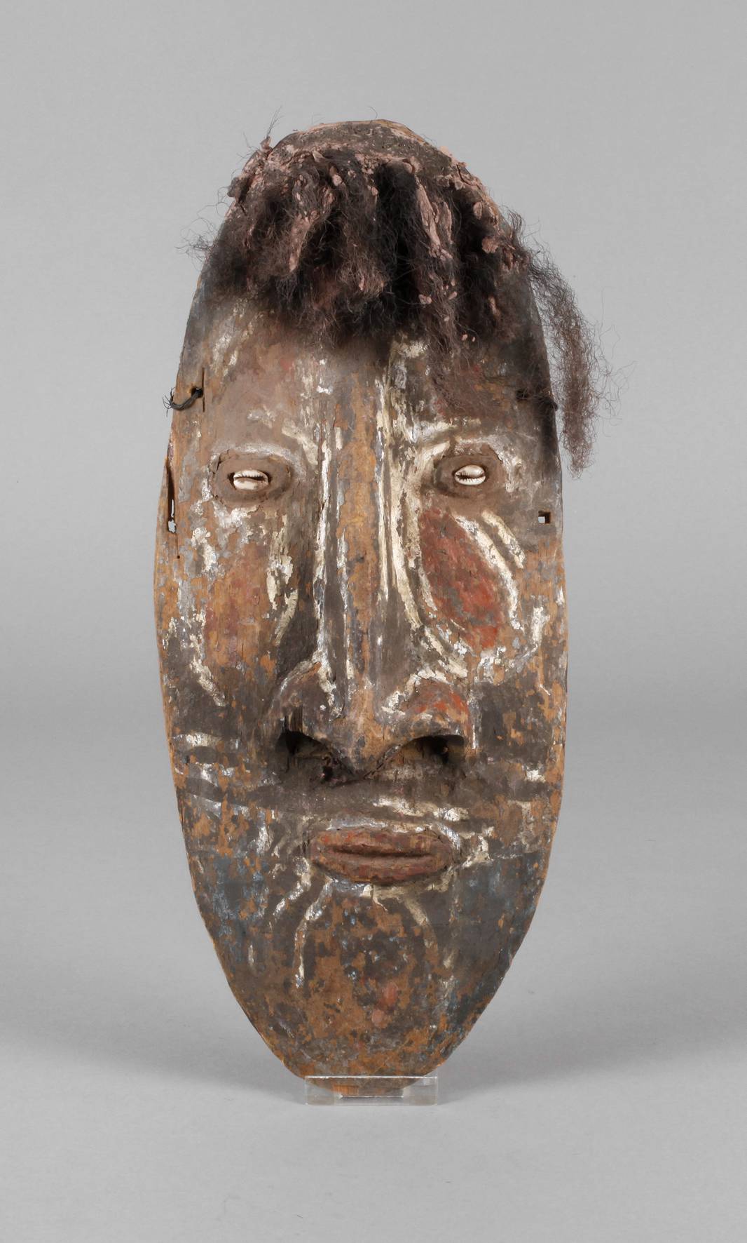 wohl aus dem Sepikgebiet, 1. Hälfte 20. Jh., Hartholz mit Resten alter Farbfassung, vermutlich Ahnenmaske, Augen aus Kaurischnecken, Echthaar etwas verkrustet, gutes Sammlerstück, H 40 cm.
