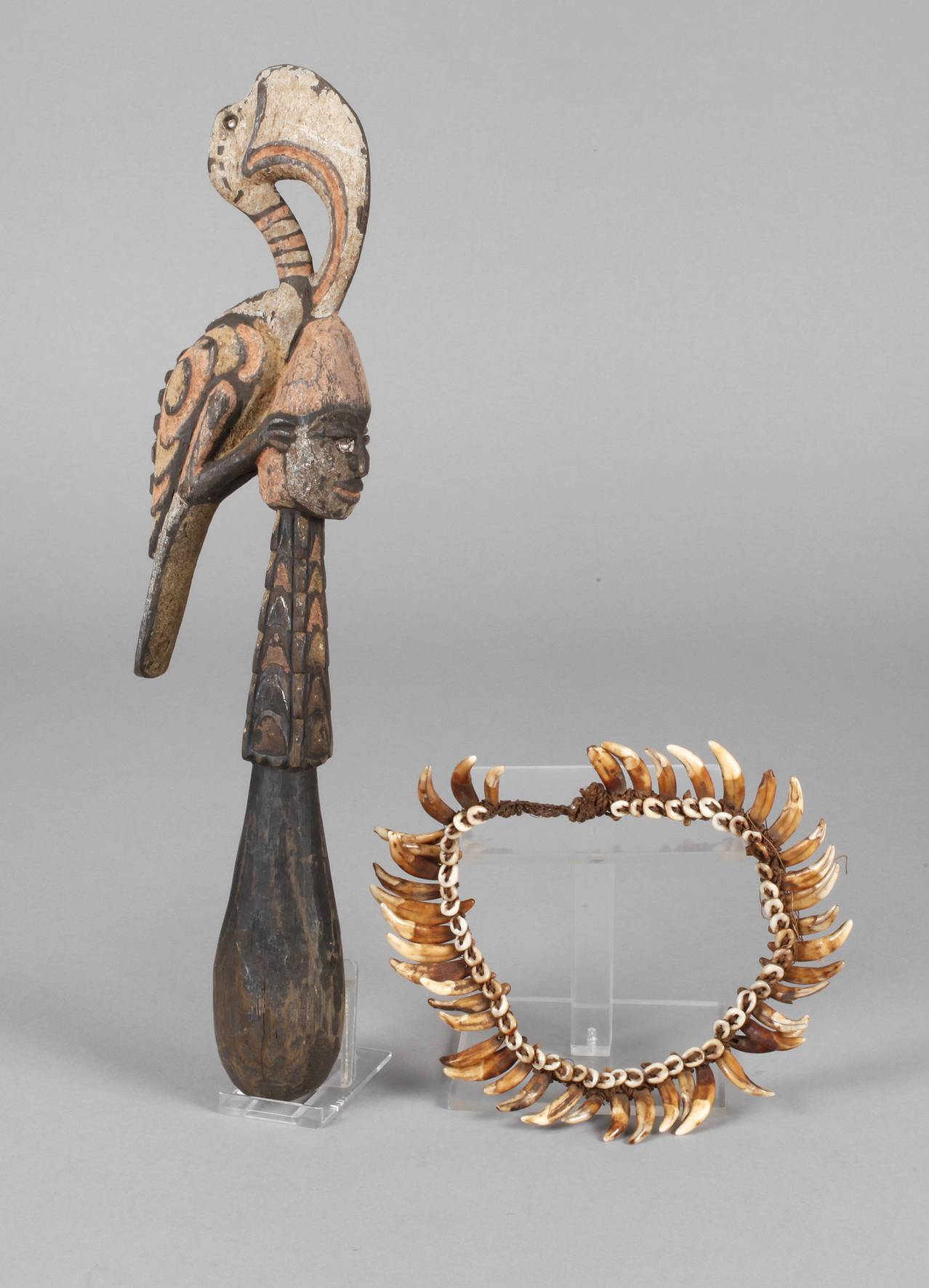 bestehend aus Zeremonialstab eines Häuptlings der Dayak, vorderseitig mit Kopfbüste, rückseitig mit Darstellung eines Nashornvogels, mit Erdfarben bemalt, H 37 cm, dazu Halskette aus Eckzähnen eines kleineren Raubtieres, L ca. 35 cm.