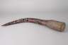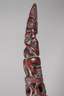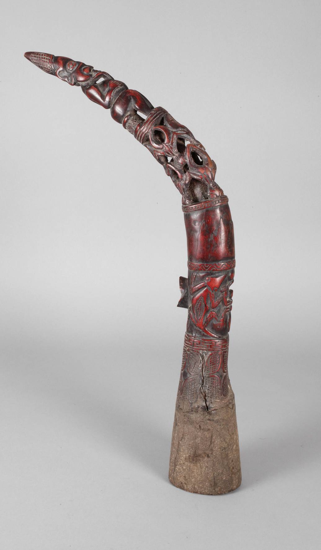 wohl um 1900, zum Deuten von Zeichen verwendet, hartes, rotbraun gefasstes Tropenholz, am Fuß unverziert, weiter oben, teils durchbrochen, in Form eines Stoßzahnes gearbeitet und aufwendig beschnitzt, Darstellung insektenartiger Wesen und bekrönt von einem sitzenden Herrscher, minimale Trocknungsrisse, gute Erhaltung, L ca. 83 cm.