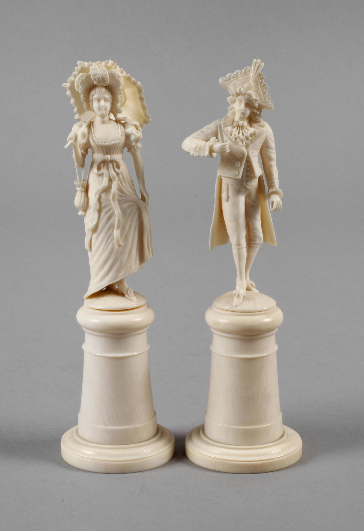wohl Erbach, um 1900, ungemarkt, Elfenbein qualitätvoll beschnitzt, teils gedrechselt, vollplastisch gearbeitetes Pärchen in der Mode des Empire, feines Fräulein mit Hütchen und Schirm, als Gegenstück ein Galant mit Dreispitz und Papiermesser, winz. best., H je 20 cm. BITTE BEACHTEN: VERSAND ERFOLGT NUR INNERHALB DER EU – SHIPPING TO THE 28 EU MEMBER COUNTRIES ONLY!
