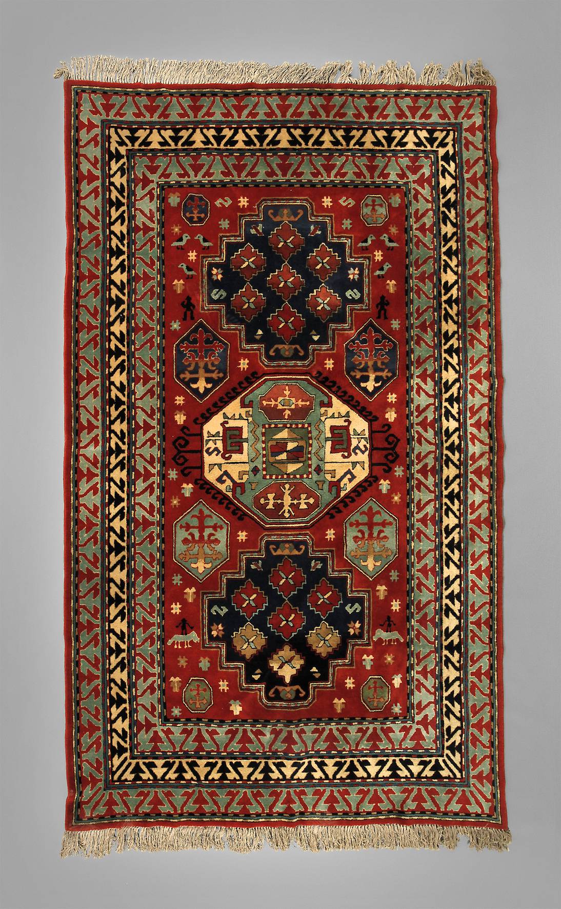 1. Hälfte 20. Jh., das Mittelfeld verziert mit drei Medaillons und stilisierten Blütenmotiven, mehrteilige geometrisch dekorierte Bordüren, guter Zustand, Maße 285 x 198 cm.
