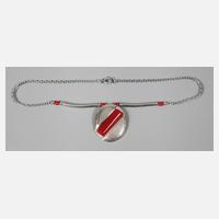 um 1930, Metall vernickelt, Mittelteil besetzt mit bordeauxroten Galalithelementen, an Zierkette, Tragespuren, L ca. 52 cm.