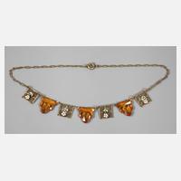 um 1920, Messing, Mittelteil teilweise mit Emaille belegt und Zwischenteile aus honiggelbem facettierten Glas, Federringverschluss, L ca. 39 cm.