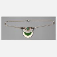 um 1930-35, Metall verchromt, mit grünem Galalith, defekt, an ca. 40 cm langer Schlangenkette, Federringverschluss.