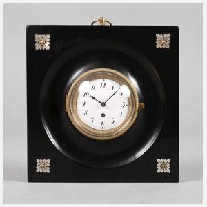 wohl 1. Hälfte 19. Jh., früheres Taschenuhrenwerk mit Ankergang, ebonisiertes Holzgehäuse mit geschnitzten Applikationen aus Perlmutt, funktionstüchtig, Emailziffernblatt mit geklebtem Ausbruch, original Schlüssel, 18 x 18 cm.
