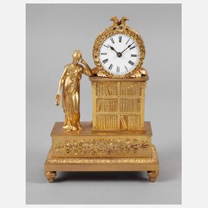 Frankreich, Ende 19. Jahrhundert, Bronze feuervergoldet, das Blattwerk mit einem Saphir und einem Opal verziert, junge Dame in antikisierendem Gewand an eine Bibliothek gelehnt, makelloses Emailziffernblatt mit römischen Ziffern, Werk mit Ankergang läuft an, Höhe 26 cm.