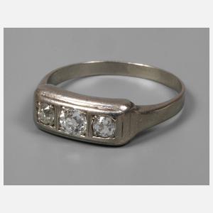 um 1920, Weißgold gestempelt 585, besetzt mit drei Altschliffdiamanten von zusammen ca. 0,4 ct in guter Qualität, Tragespuren, RW 18 mm, G ca. 3,4 g.