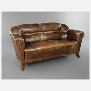 um 1925, bequemer Zweisitzer, mit originalem braunen Lederbezug, Füße aus massivem Eichenholz, komplett rissfrei, guter Originalzustand, Maße 88 x 175 x 85 cm.