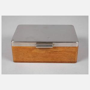 Entwurf um 1930, Ausführung Ruppelwerke Gotha, an der Unterseite brandgestempelt mit zusätzlichem Schriftzug geschützt, rechteckiger Korpus aus Nussbaum mit abgerundeten Ecken, der scharnierte Deckel aus gebürstetem Weißblech, sehr gute Erhaltung, Maße 4,5 x 12 x 9 cm.