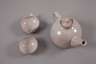 um 1940, ungedeutete Ritzmarke R mit Kreuz, zusätzlich Kr, ziegelroter Scherben mit weißlicher Craqueléglasur, Kernstück und zwei Gedecke, am Ausguss minimalst bestoßen, L Kanne 22 cm.