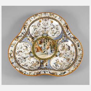 wohl Keramikwerkstatt von Orazio Fontana (1510-1571), in außergewöhnlicher Trilobataform, dreipassig geschweift gestaltete Schale der italienischen Renaissance, polychrom verziert mit kobaltblauem, gelbem, gelb-orangem, grünem und braunem Mangan sowie einem Hauch von Zinn, auf der Rückseite mit drei herzförmig drapierten Schwanenpaaren modelliert, eine subtil raffinierte, groteske Dekoration überzieht beinahe die gesamte Schauseite, ebenso in den muschelförmigen Reserven und umlaufend auf der Fahne, von einem zentralen Kandelaber ausgehend verzweigen sich diese Grotesken symmetrisch zu mannigfaltigen Figurationen wie Satyrn, Seeungeheuern und Kleintieren, das als Tondo gestaltete, fein gemalte Zentralmotiv zeigt die Szene der Unterwerfung der Helvetier durch Julius Caesar, den von Wellenmotiven durchmusterten Raum zwischen den Reserven nehmen Triton und zwei Nereiden ein, die Platte ist fachgerecht nicht sichtbar restauriert, Maße ca. 44 cm x 46 cm.