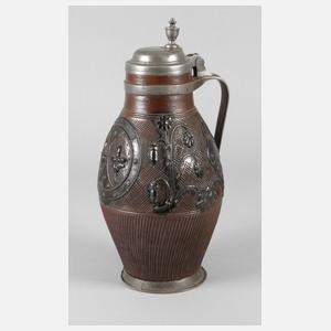 um 1800, braunes Steinzeug salzglasiert, reicher Ritzdekor, florale Modelauflagen, manganfarben bemalt, Zinnmontierung bestehend aus Standring, Zinnring, welcher in den Henkel übergeht und übergreifendem Deckel mit Urnendrücker, an der Mündung ein unbedeutender kleiner Chip, sonst makellose Erhaltung, H 35 cm.