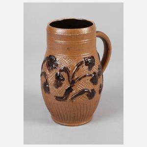 19. Jh., helles Steinzeug handabgedreht, hellbraune Salzglasur, Ritzdekor, florale Modelauflagen mit dunkelbrauner Bemalung, sehr guter Zustand, H 17 cm.