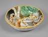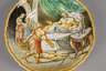 wohl 19. Jh., ungemarkt, Majolika mit farbigem Pinseldekor, mythologische Szene Bärtiger im Baldachinbett, auf ein totes Tier schauend, daneben drei Bedienstete mit entschuldigenden Gesten, Abriebstellen am Rand und herstellungsbedingte Glasurfehlstellen, D 28 cm.