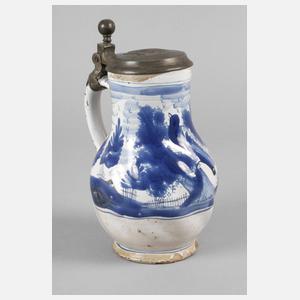um 1690, sandfarbener Fayencescherben weißlich glasiert und mit blauer Scharffeuerfarbe bemalt, gedreht gerippt und gebaucht, Landschaft mit Zäunen, Hügel und Vogel zwischen Bäumen, Zinndeckel mit reliefiertem reußischen Wappen jüngere Linie und dem Datum 1696, ausgebesserte Abplatzer an Stand und Mündung, H 21 cm.