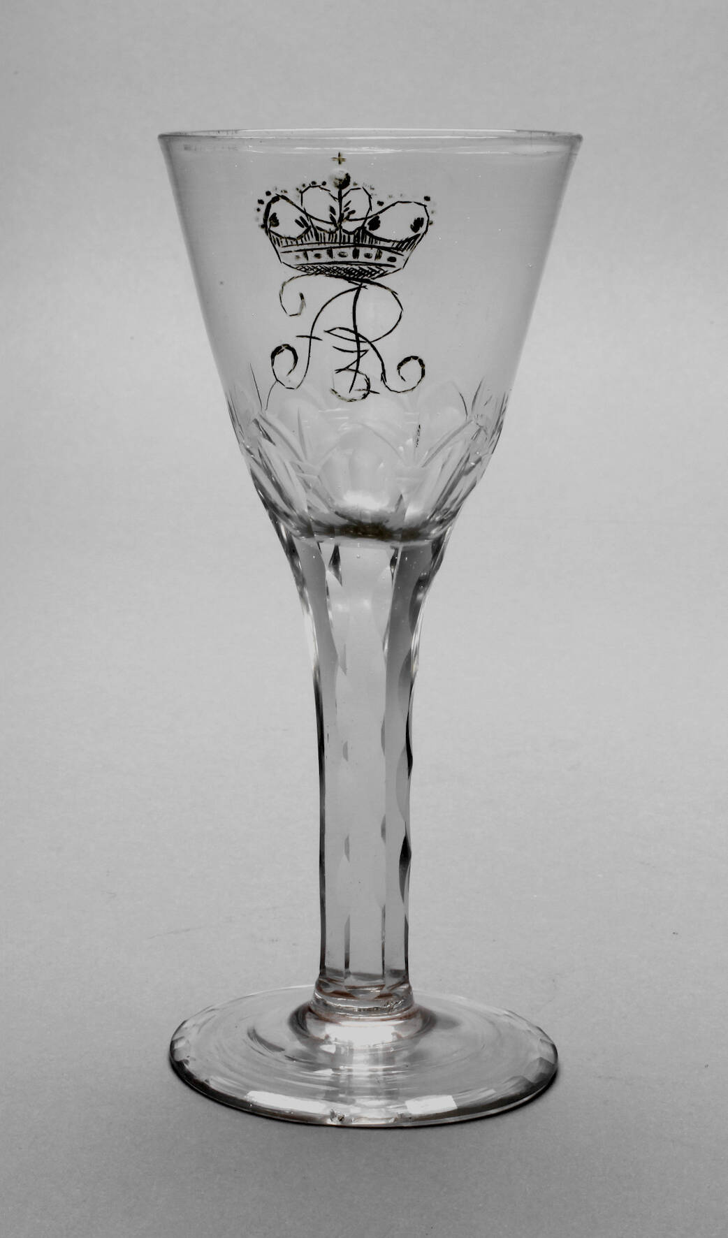 Sachsen, 1. Hälfte 18. Jh., farbloses, leicht blasiges Glas, Scheibenfuß mit geschliffenem Rand, durchgebödeter, massiver, facettierter Schaft mit geschliffenen Kanten, blütenartig geschliffener Kuppenansatz, Monogramm mit Kurfürstenkrone, Reste alter Vergoldung, am Stand ein kleiner Chip, sonst guter altersgemäßer Zustand, H 17 cm.