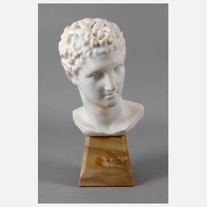 um 1900, unsigniert, Alabaster, Antikenrezeption, Darstellung nach der bekannten, sich im Museum zu Olympia befindlichen Statue, die dem Bildhauer Praxiteles zugeschrieben wird, das auf ca. 340 vor Christus datierte Original verkörpert die griechische Kunst im Übergang von der späten Klassik zum Hellenismus, auf Marmorsockel, gute Erhaltung, H gesamt ca. 47 cm.