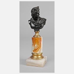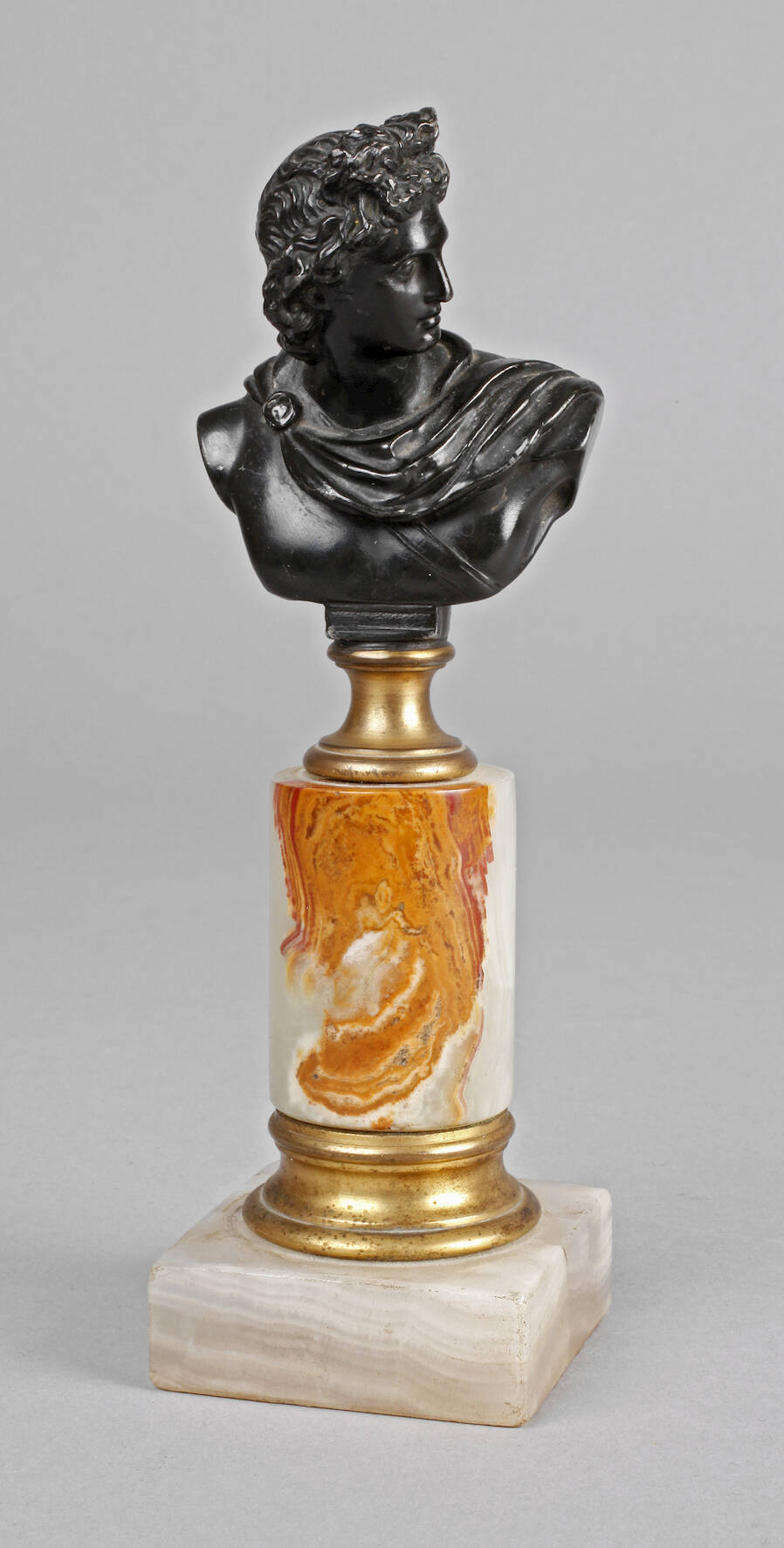um 1900, unsigniert, Metallguss dunkel patiniert, Bruststück eines jungen Mannes mit gelocktem Haar und Umhang, verkleinerte Version nach der antiken Marmorskulptur, die Ende des 15. Jahrhunderts in Terracina wiederentdeckt wurde und als ein herausragendes Beispiel klassischer Bildhauerkunst gilt, sie befindet sich heute im Statuenhof des vatikanischen Belvedere und ist Teil der Antikensammlung der Vatikanischen Museen, die antike Marmorstatue ist die römische Kopie eines im Original in Bronze ausgeführten Werkes, das zwischen 350 und 325 v. Chr. geschaffen worden war, auf mehrteiligem Sockel aus Messing und Onyx, winzigst berieben, H gesamt ca. 17,5 cm.
