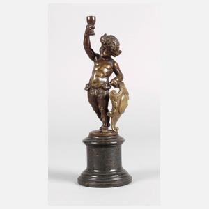 wohl Sachsen, um 1800, unsigniert, Bronze dunkel patiniert, Darstellung des Bacchus als Putto mit erhobenem Becher, Kopf und Hüfte mit Weinlaub umschlungen, auf ein Schild mit freier Wappenkartusche gestützt, alles teils ornamental fein nachziseliert, auf rundem, getrepptem und gekehltem Serpentinsockel, dieser gedrechselt, Patina berieben, sonst gute altersgemäße Erhaltung, H Bronze ca. 16,5 cm, H gesamt ca. 23 cm.